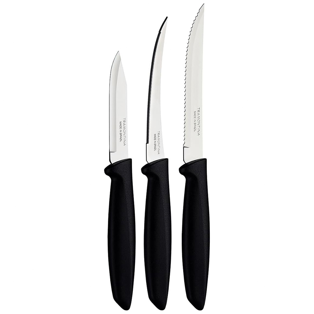 العلامة التجارية: ترامونيتا النوع: طقم سكاكين اللون: أسود فضي عدد القطع: 3 قطع عن المنتج: شفرة من الفولاذ المقاوم للصدأ تتميز بحافة تدوم طويلاً بفضل المعالجة الحرارية. مقبض من البولي بروبيلين أكثر مقاومة ومتانة. آمنة للاستخدام في غسالة الأطباق، مما يُسهّل حياتك اليومية. يتكون من: سكينة للخضار والفواكه 3 انش سكينة طماطم 4 انش سكينة ستيك 5 انش